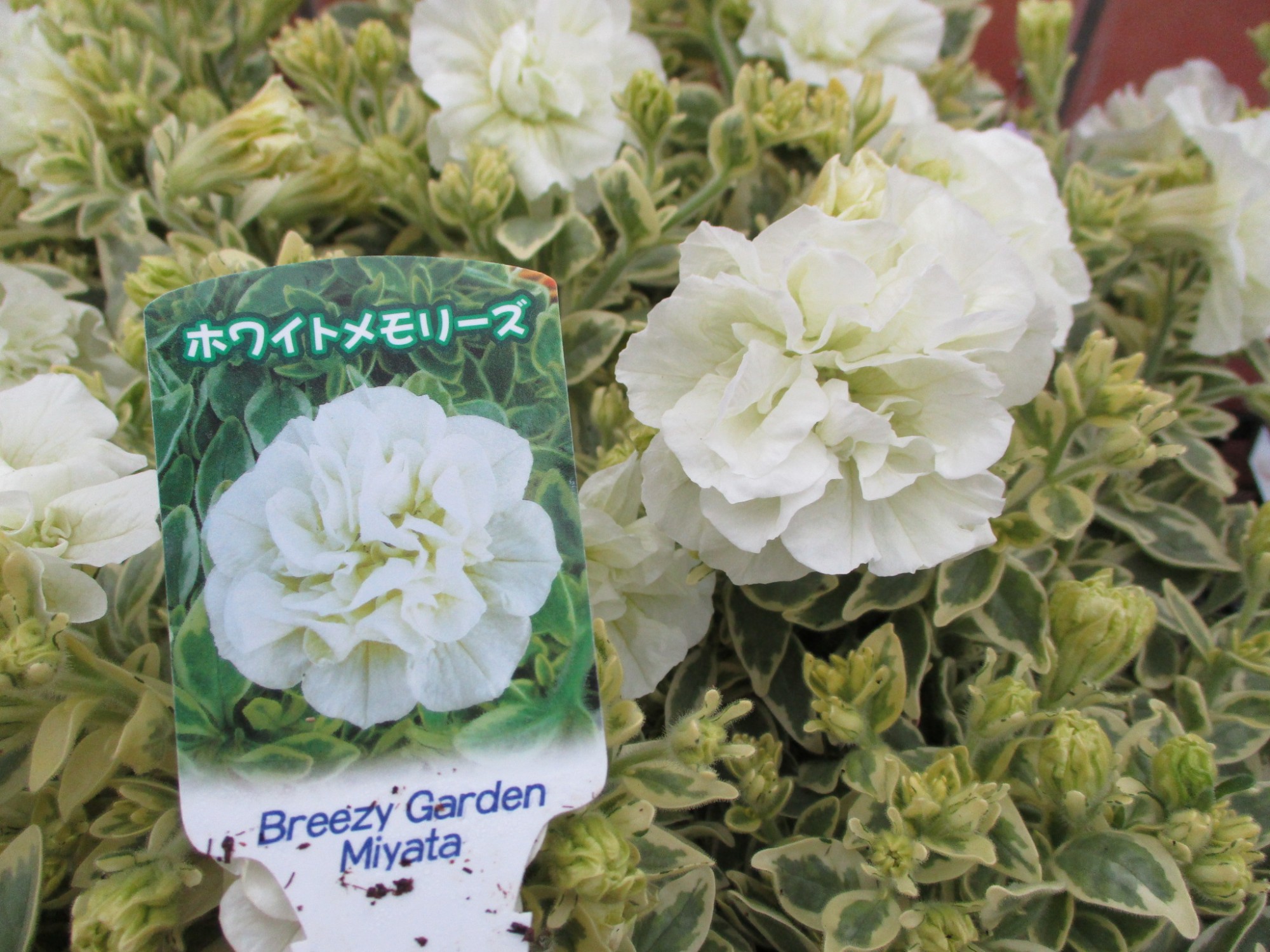 今回は似ていますが 葉の色がちょっと明るめです。白の八重咲ペチュニア。 是非店頭でご覧いただければと思います。