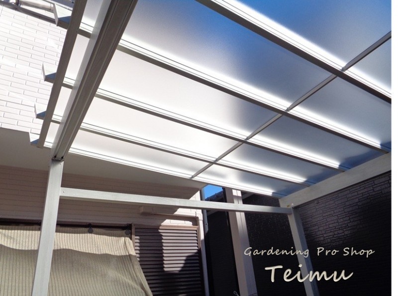 建物にあわせて木目はシルキーノーチェ色に、屋根は部屋の明るさも欲しかったのでポリカのかすみ調にしました。